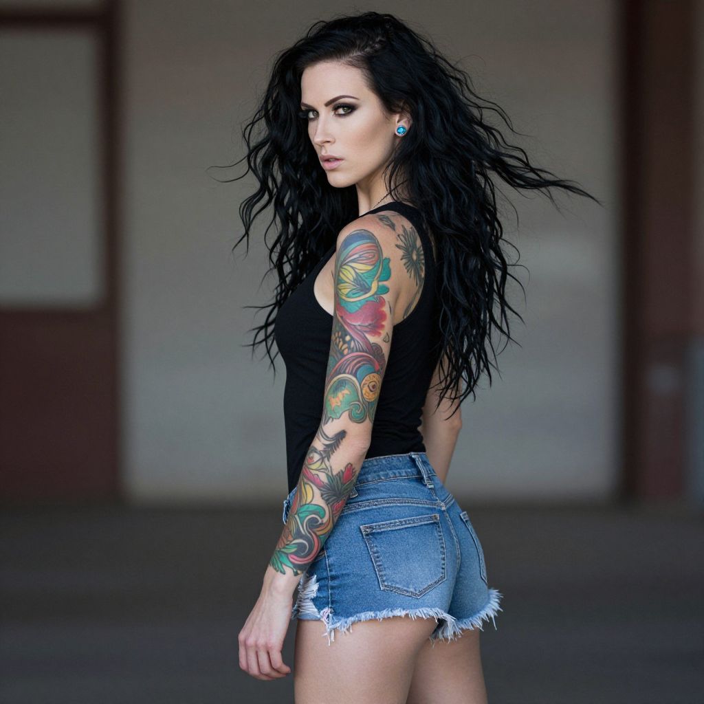 Photograph of a tattooed woman with long black hair, wearing a black tank top and blue denim shorts, standing in a sunny urban area, hand