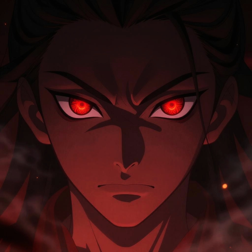 Stylized anime red demon eyes glowing vividly against a shadowed face, intricate patterns in the irises, fierce and menacing gaze, dark fantasy setting, smoky background with embers, high contrast and rich red hues.