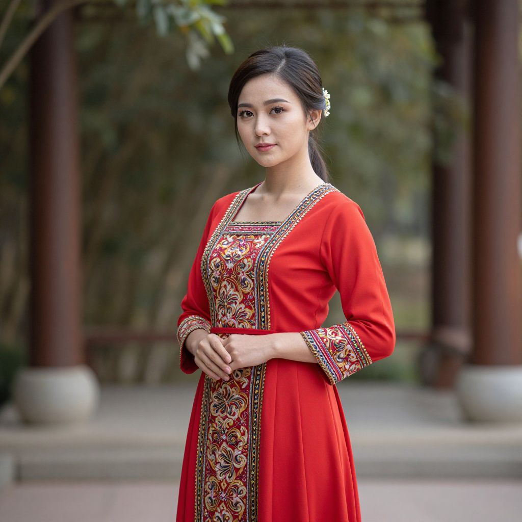 Photograph of an Asian woman with fair skin, black hair in a bun, wearing a red traditional dress with intricate embroidery, standing outdoors against a blurred