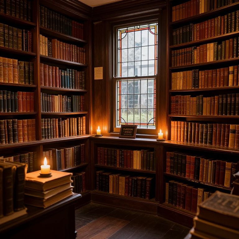 Dutch's vintage bookstore interior, shelves filled with old leather-bound books, cozy reading nooks by stained glass windows, warm candlelight illuminating textured wood and worn pages, evoking a timeless and inviting literary atmosphere.