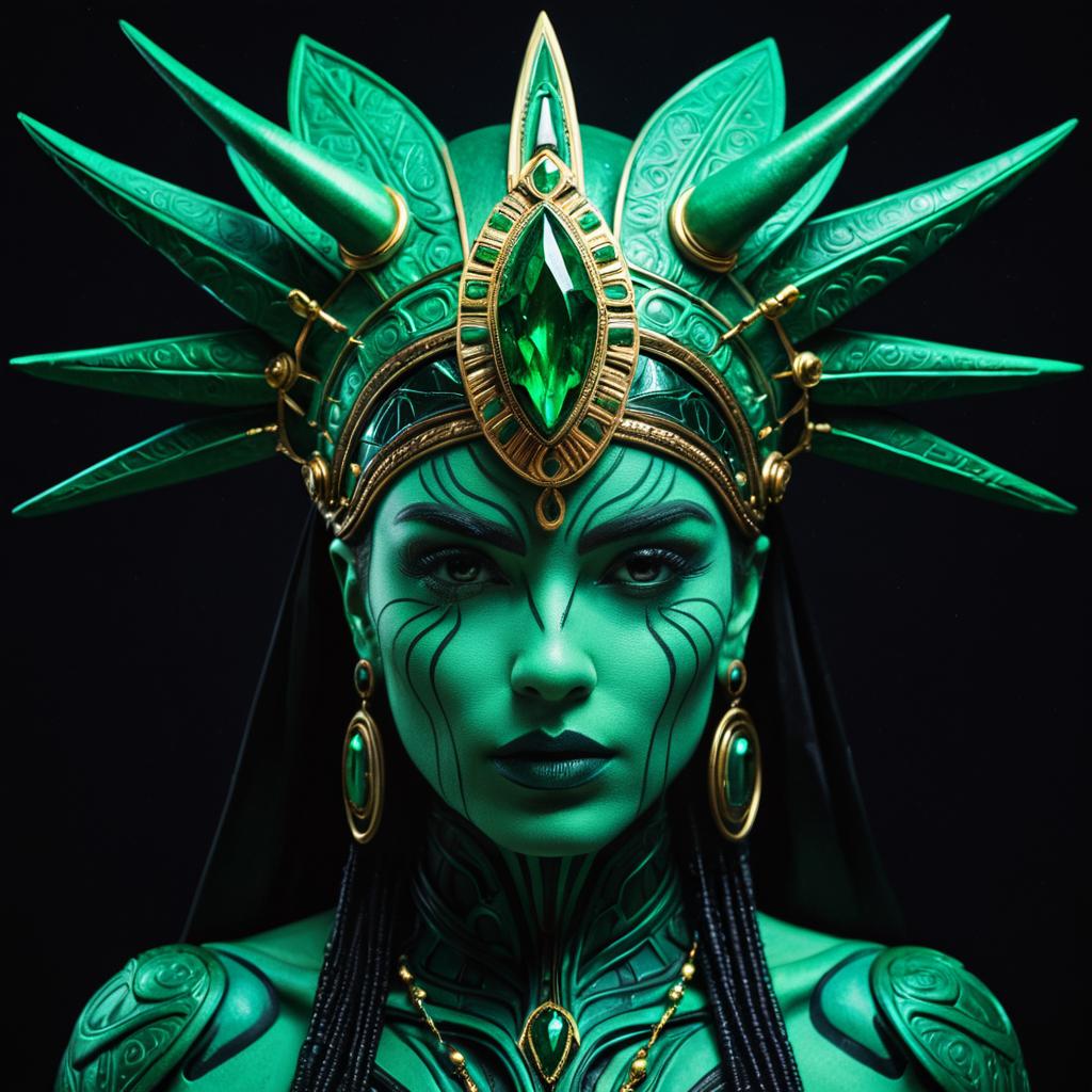 Woman with blue and gold skin, surreal braided hair, airbrush painting, highres, detailed, neo-primitivism, biopunk, vibrant lighting, professional.