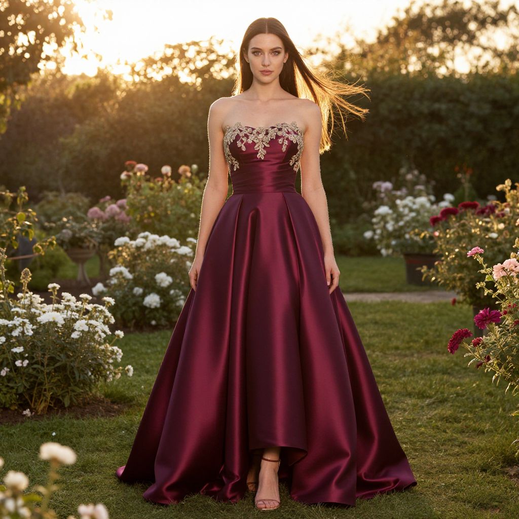 A woman, evening elegance, satin ball gown in rich plum, strapless with a straight neckline, bodice embellished with gold lace appliqué, nipped waist, pleated full skirt, ankle-length, sandal heels with thin straps, minimalist makeup, long straight hair, golden hour glow, backlit subject, ethereal feel, standing in a lush garden, blooming flowers, soft sunlight filtering through trees, gentle breeze, serene atmosphere Sexy. Pretty face and beаutiful eyes. Big breasts