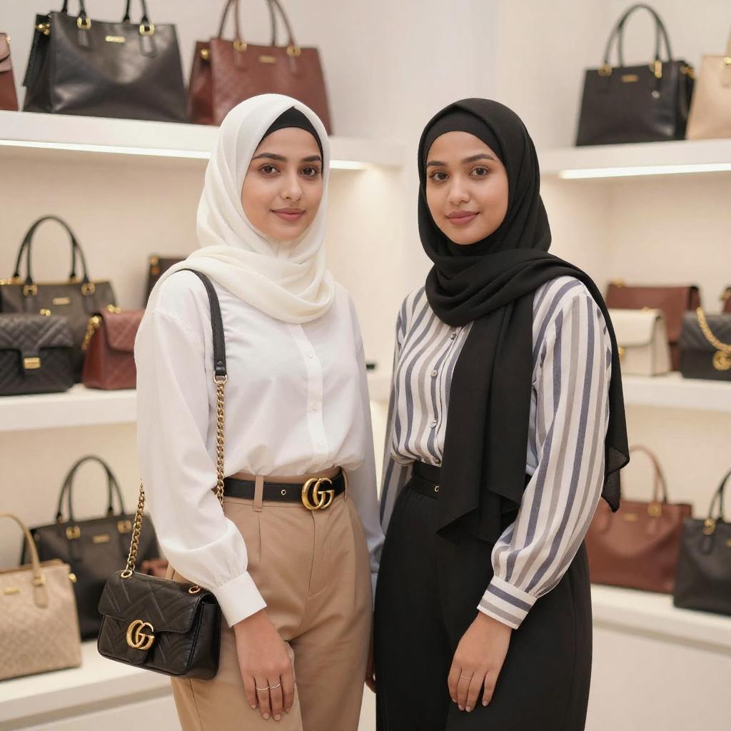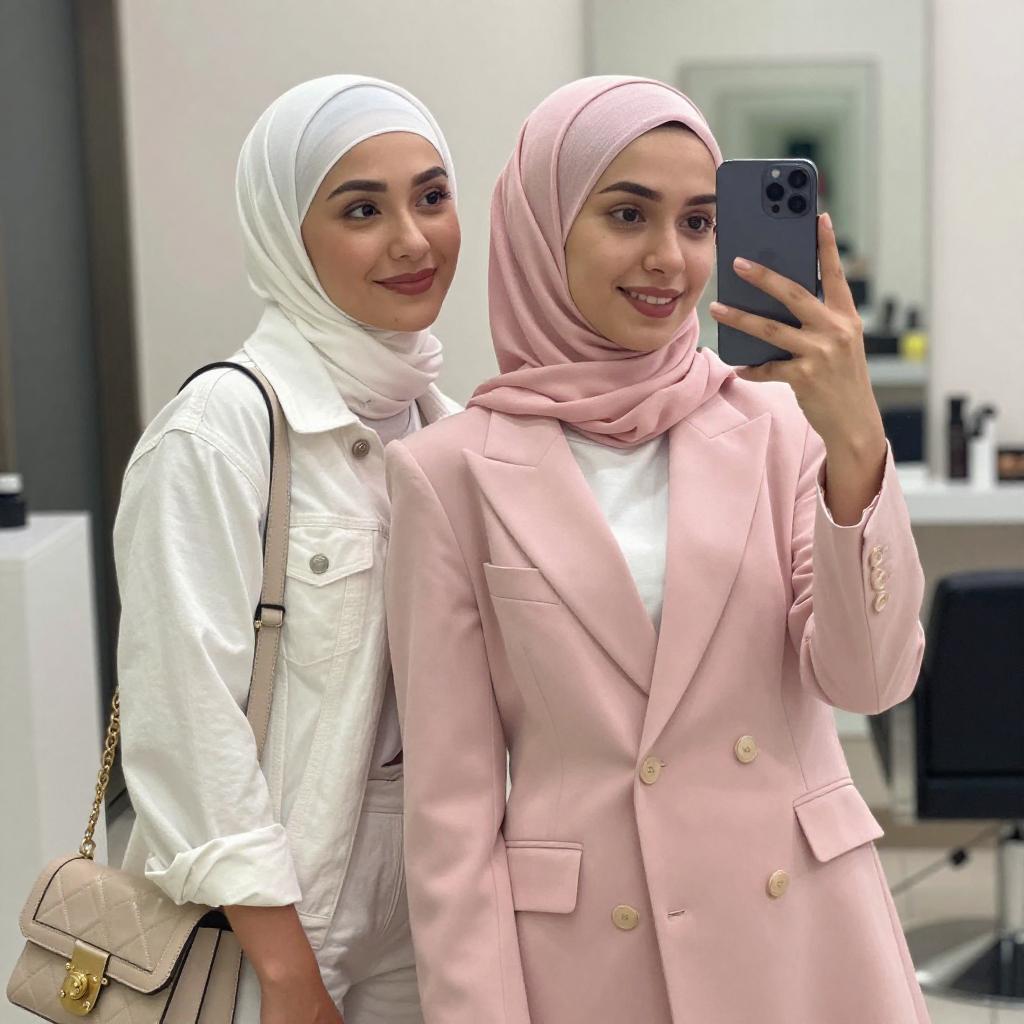 Photograph of two smiling women standing close together in an urban setting. Both wear hijabs; the woman on the left has a beige hijab and beige suit, while the woman on the right has a light green hijab and matching dress. The background features a brightly lit storefront with glass windows and a few potted plants.