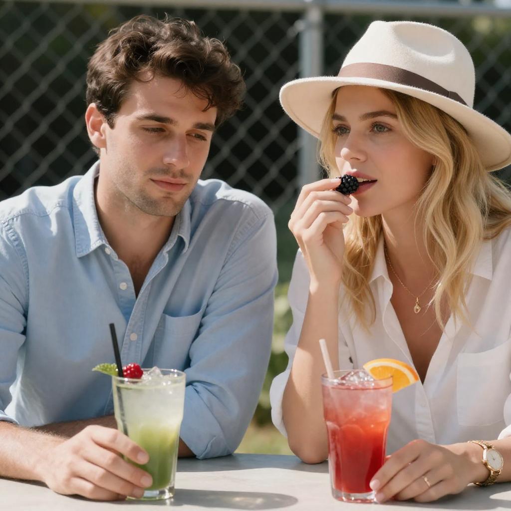 Photograph of a man and woman at an outdoor table. Man with short dark hair, light blue shirt, and drink with green and red garnish. Woman with blonde hair, white hat with brown band, white shirt, and drink with red and orange garnish. Woman holds black berry close to her mouth, looking at it. Chain-link fence in background. Sunlight illuminates scene. Both have neutral expressions. Two drinks on table, one in front of each. Woman's hand rests on table. Man looks down at drink.
