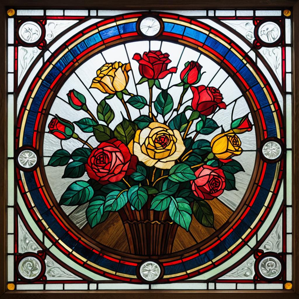400 megapixel photo of stained glass artwork depicting a vibrant bouquet of roses with a circular wooden frame, vibrant colors, intricate detail, clean lines, high-quality craftsmanship