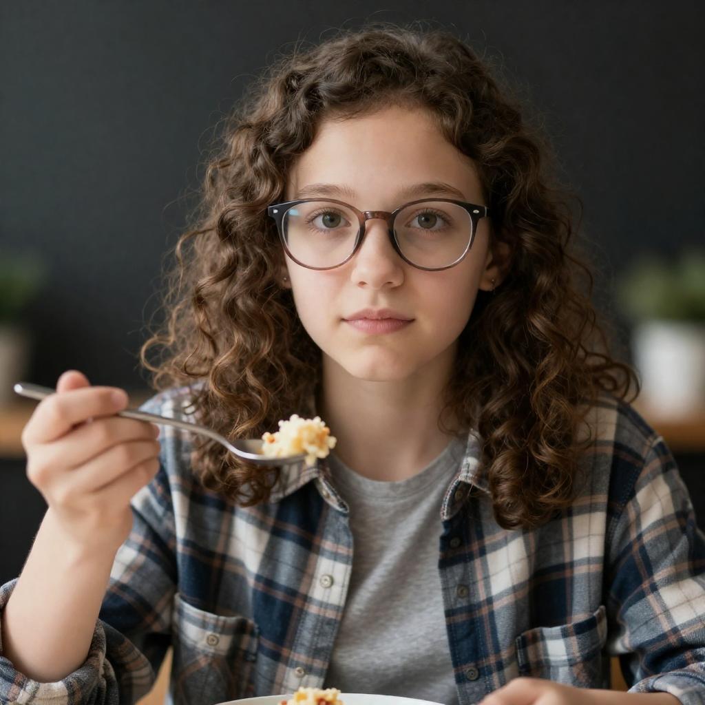 Photograph of a young girl with curly brown hair and glasses, wearing a plaid shirt over a gray shirt, holding a spoon with food in her right hand. She has a neutral expression. Dark, blurred background. One hand and food visible in the foreground.