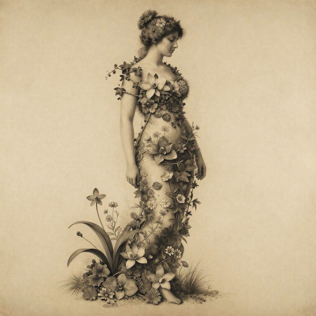 Surreal pencil drawing by Marco Mazzoni depicting a young girl with hair interwoven with autumn leaves, with soft flowing lines, crisp leaf veins, and warm shadows, in nostalgic and tranquil, highly imaginative and detailed