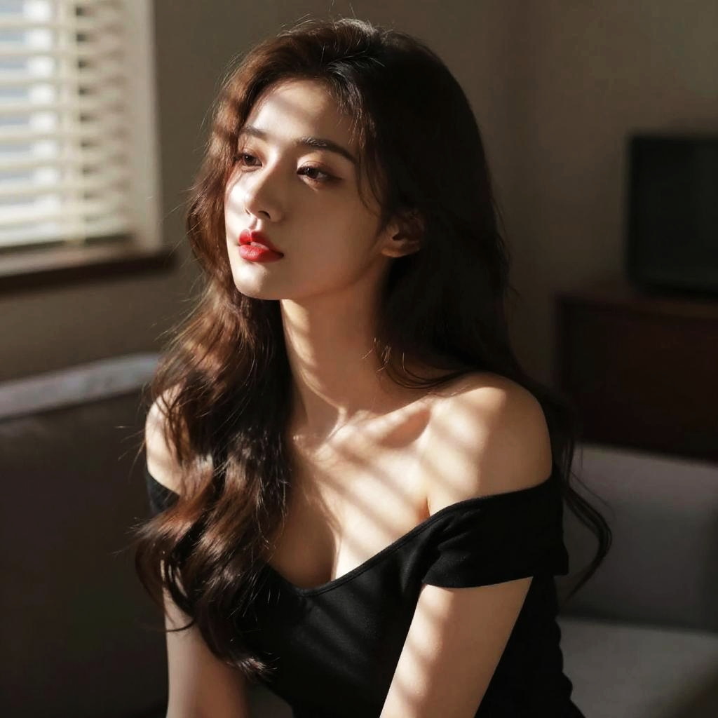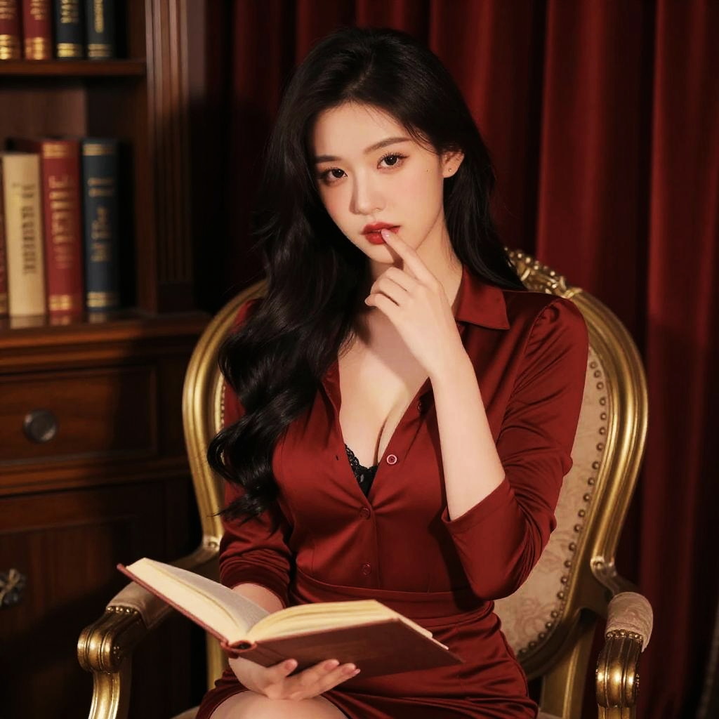 Photograph of an Asian woman with long black hair, fair skin, and red lipstick, sitting in an ornate, gold-accented armchair. She wears a deep red, long-sleeved button-up blouse with a slight V-neck, revealing a hint of black lace. She holds an open book in her lap with her right hand and touches her lips with her left index finger, exuding a contemplative expression. The background features a wooden bookshelf with numerous books, and dark red curtains. The lighting is warm, enhancing the rich colors and textures, creating a cozy, intellectual atmosphere.
