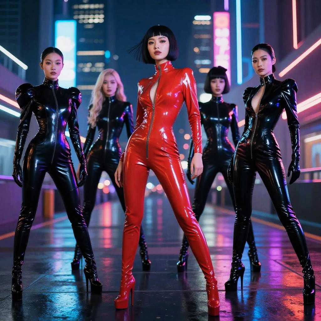 AI tween girls posing as digital superheroes, neon-lit cityscape background, blending youthful energy with futuristic tech suits, dynamic action poses, vivid colors