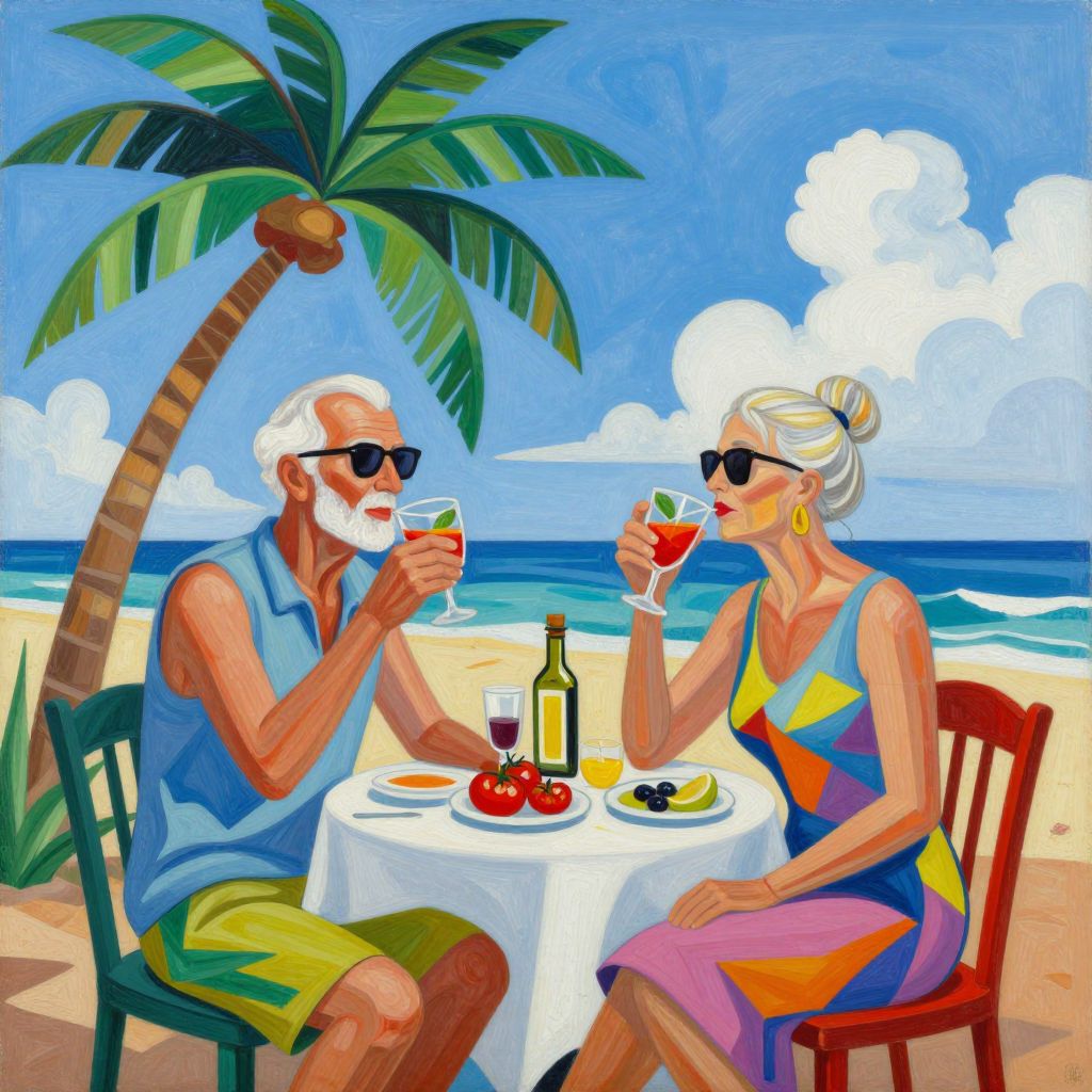 Vibrant digital painting of elderly couple with white hair, sunglasses, tropical beach, palm tree, and round table with drinks and food.