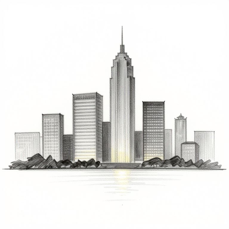 Simple sketch art of a modern city skyline at dusk, clean lines with light hatching, minimalist style, focus on architectural outlines and light reflections, monochromatic graphite sketch emphasizing structure and balance