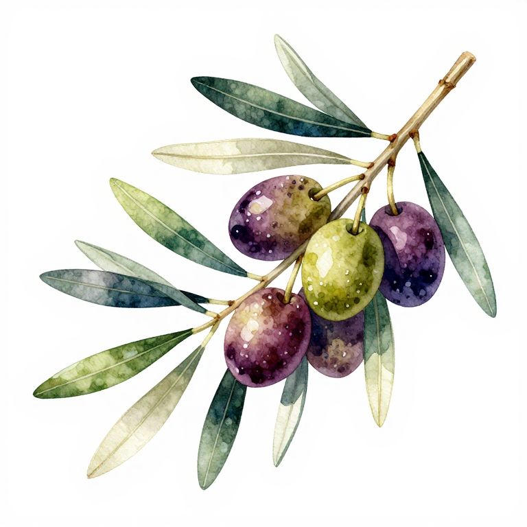 The image depicts a detailed watercolor illustration of an olive branch set against a white background. The branch is adorned with a variety of olives in different stages of ripeness, including green and purple hues. The leaves are elongated and have a glossy texture, with some leaves exhibiting a gradient of green to blue. The branch itself is thin and slightly curved, with small, delicate twigs extending outward. The overall composition is balanced, with the olives and leaves arranged in a natural, organic manner, creating a sense of depth and realism. The interplay of colors and textures, combined with the intricate details of the leaves and olives, gives the illustration a lifelike quality.