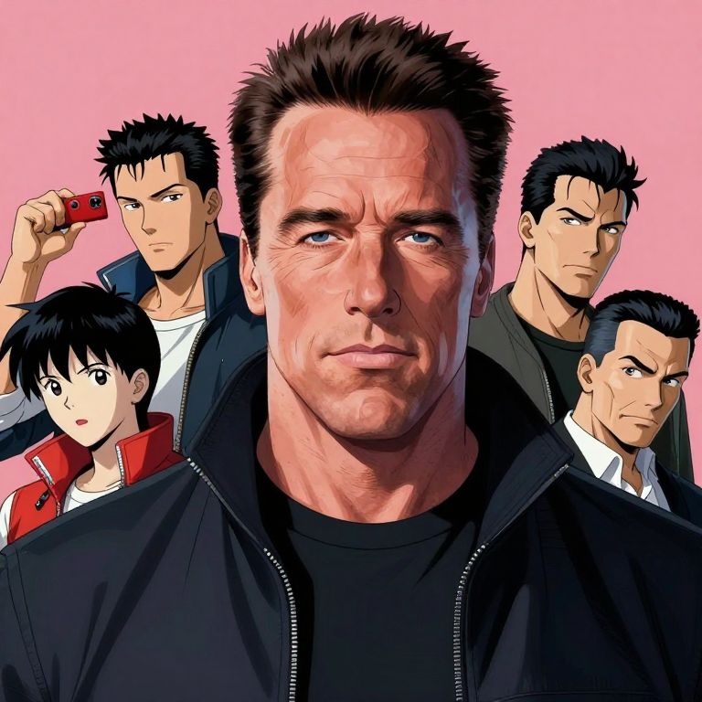 Digital anime-style illustration of a muscular, serious-looking man with spiky brown hair in the center, surrounded by four similarly styled, stern-looking men in