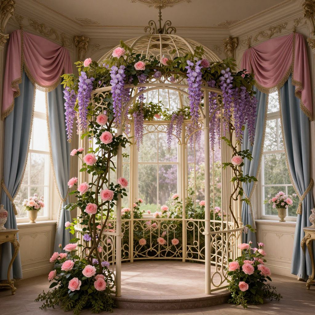 Photograph of an ornate, sunlit conservatory room featuring a white, wrought-iron floral archway adorned with pink roses, purple wisteria, and greenery. The archway stands in the center, framed by tall, blue curtains with pink valances. Sunlight filters through large, arched windows in the background, illuminating a wooden floor and white, decorative walls. Potted flowers sit on the floor and window ledges, enhancing the room's lush, romantic ambiance. The overall style is elegant and Victorian, with intricate details and a soft, pastel color palette.