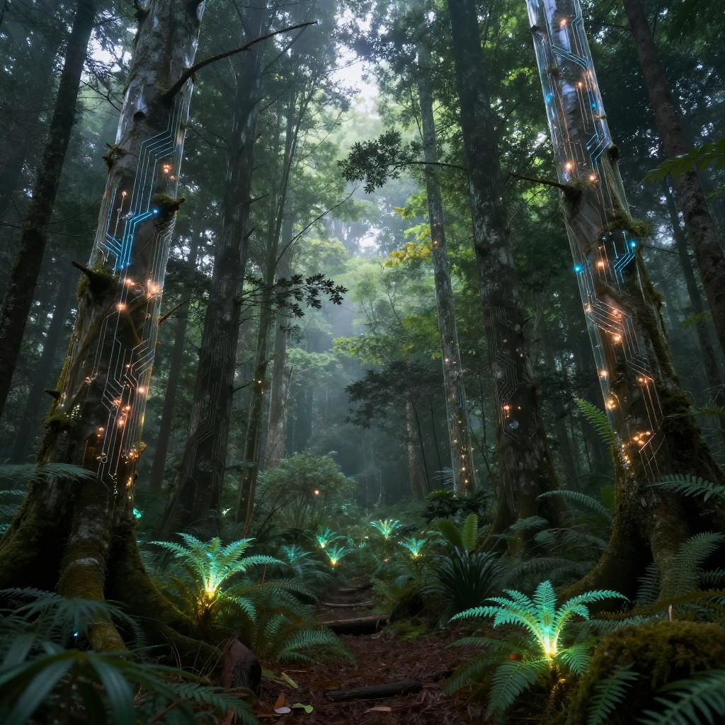 Ai art generator landscape depicting a dense forest where trees have transparent bark revealing circuit-like veins, bioluminescent plants illuminating the ground, a misty atmosphere mixing natural beauty with sci-fi aesthetics, richly detailed environment with vibrant light contrasts
