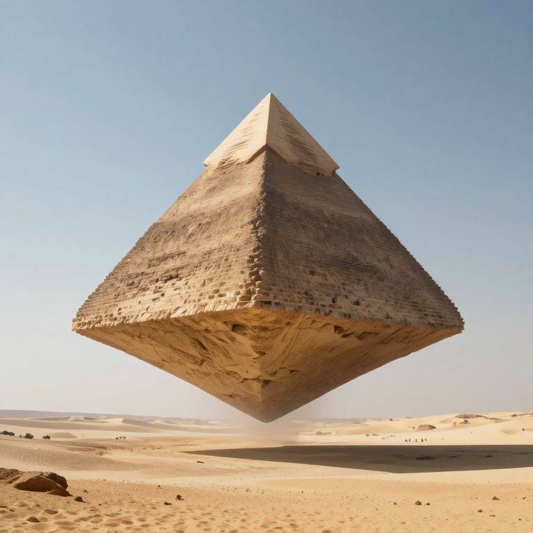 A colossal, inverted pyramid defies gravity as it hovers serenely above a desolate desert landscape, its sharp apex piercing the heavens while its base rests mysteriously in mid-air, casting an otherworldly shadow below.
