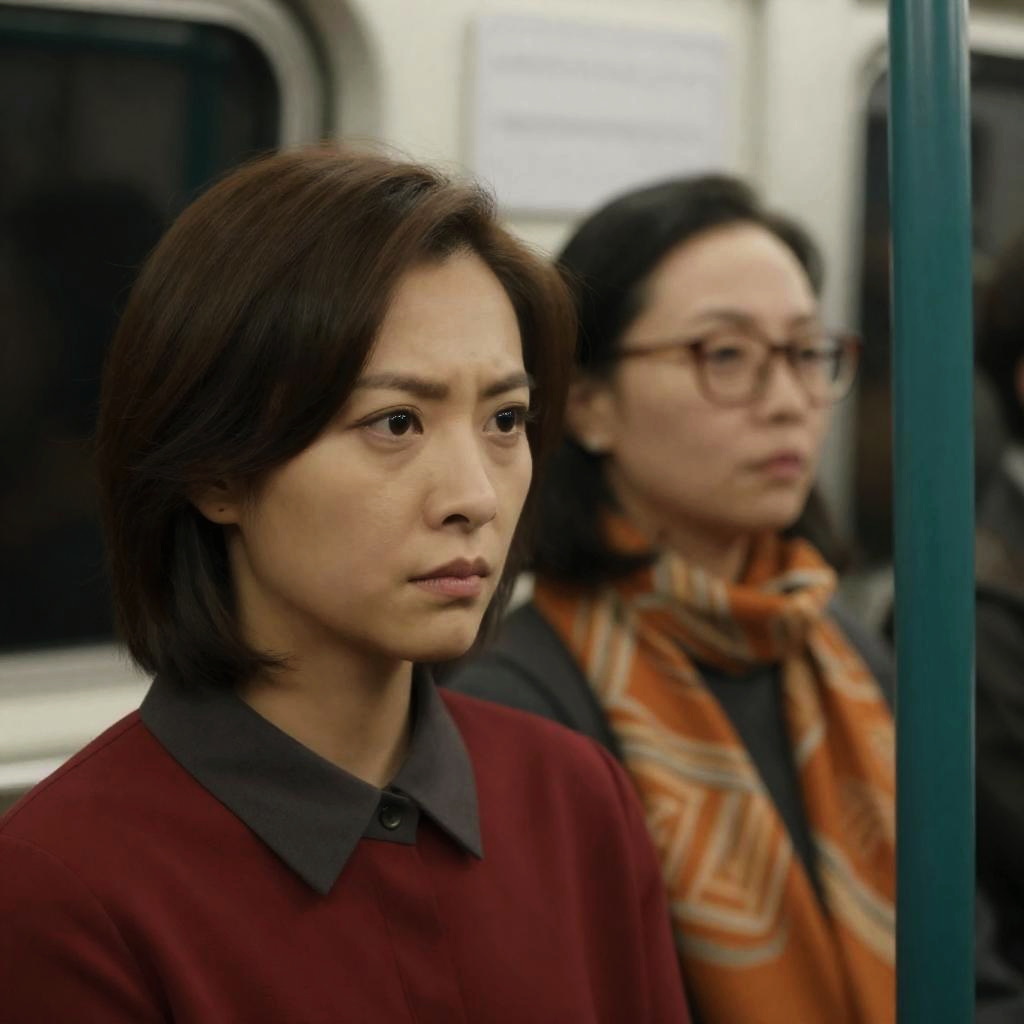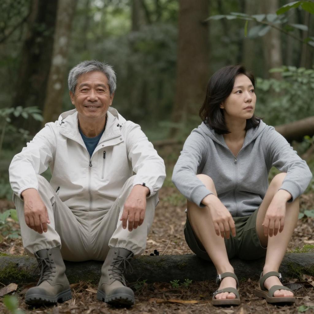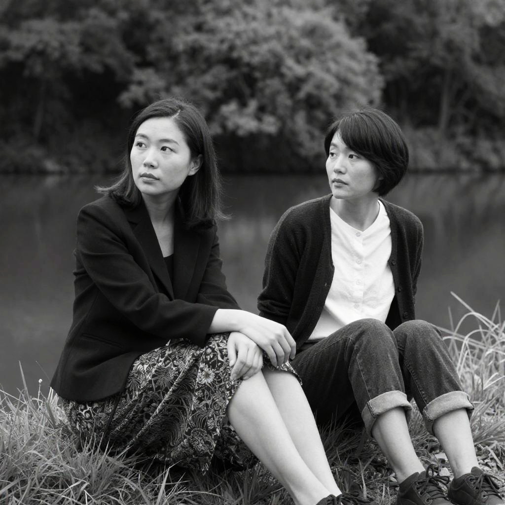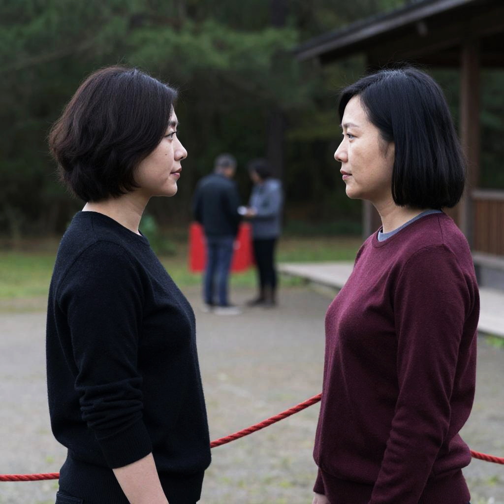 Photograph of two women standing outdoors in a forest, facing each other. Both have short dark hair. Left woman wears black long-sleeve shirt, right woman wears maroon sweater over gray shirt. Red rope connects them. Background includes green trees and a wooden structure. Two people in background near red objects.