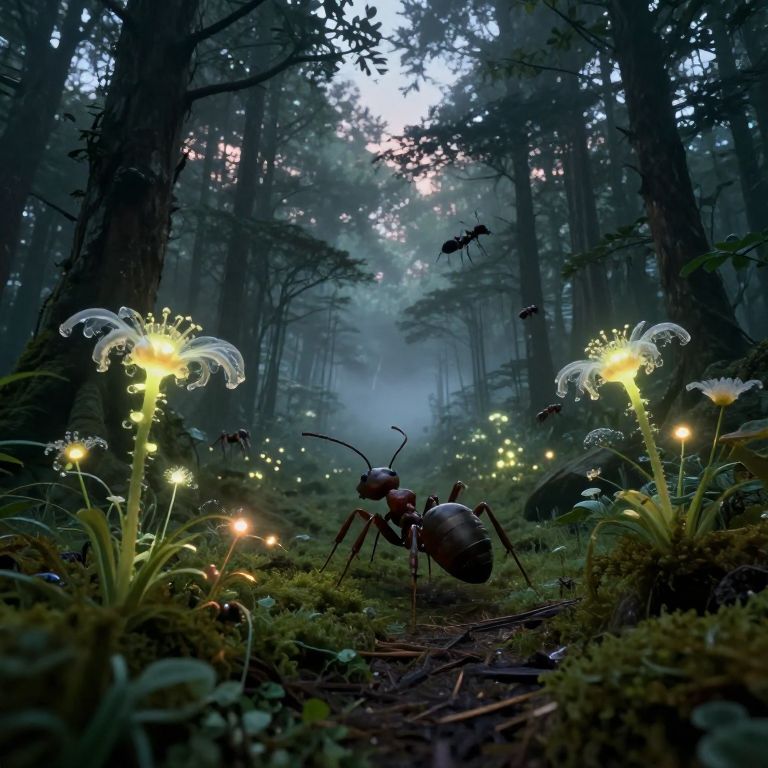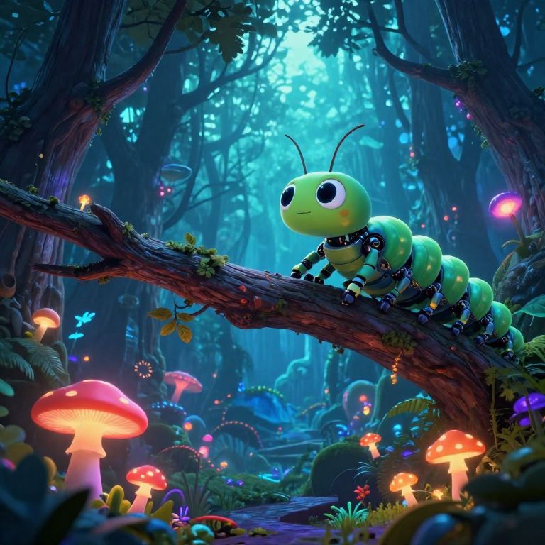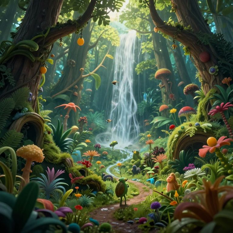 Fantastical forest scene with a whimsical, large-headed bee on a giant pink flower, surrounded by twisted trees and pastel clouds. Digital art