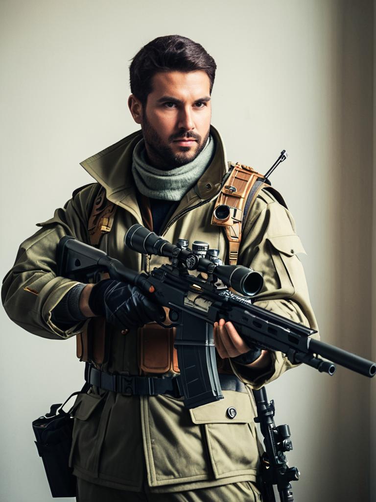 Portrait of a man dressed in a realistic sniper costume cosplay outfit. He is wearing a tactical jacket with multiple pockets, a scarf around his neck, black gloves, and a military harness. He holds a sniper rifle equipped with a scope and suppressor, posing against a neutral background. The image captures the serious and focused expression of the subject.