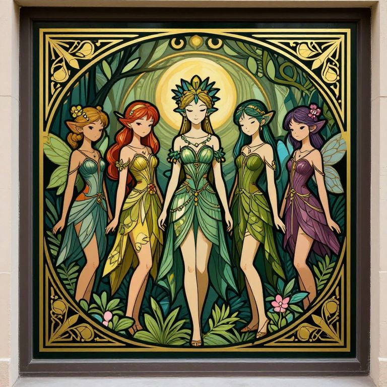 Digital 2D art deco style illustration featuring seven nature sprites standing side by side. Each sprite is adorned with intricately detailed dresses in shades of green, gold, and blue, with floral and leaf motifs. They have delicate wings, pointed ears, and floral crowns, embodying a fantasy nature theme with vibrant colors and elegant compositions.