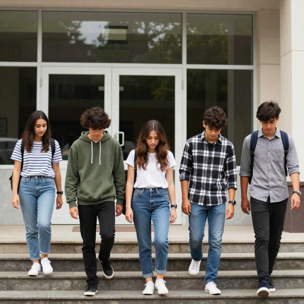 Photograph of five students walking up stone steps in front of a modern building with large windows. They're dressed in casual clothes: one in a striped shirt, another in a green hoodie, a third with long brown hair and a white shirt, a fourth in a black and white plaid shirt, and the last in a gray checkered shirt. The background shows trees and reflections in the windows.