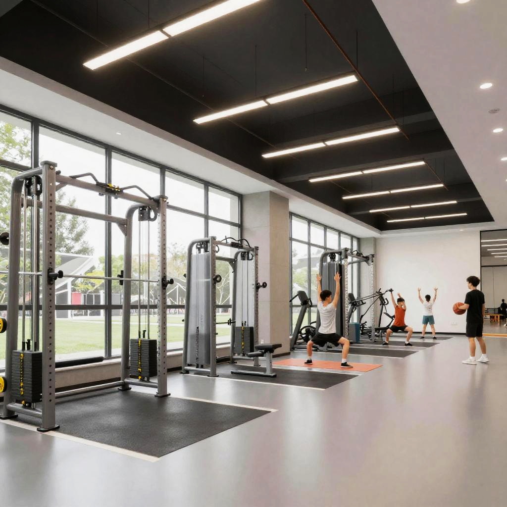 Modern school gym filled with state-of-the-art workout equipment, large windows letting in natural light, polished floors, students practicing yoga and basketball, contemporary design elements