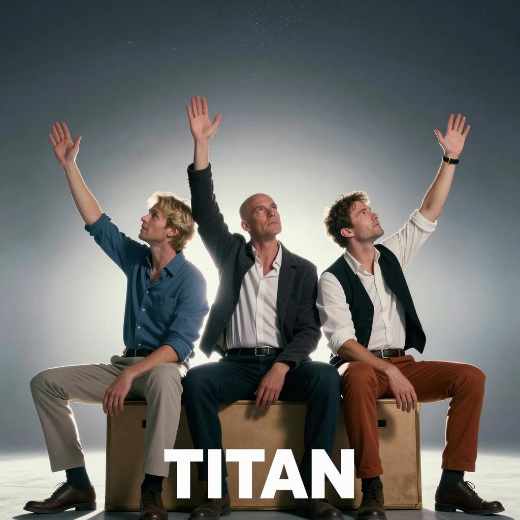 Three men sitting on a box, arms raised, against a starry sky. The man on the left has blonde hair, blue shirt, and light pants. The man in the middle has a bald head, dark jacket, and white shirt. The man on the right has brown hair, white shirt, black vest, and orange pants. Bright light behind them. "TITAN" at the bottom.