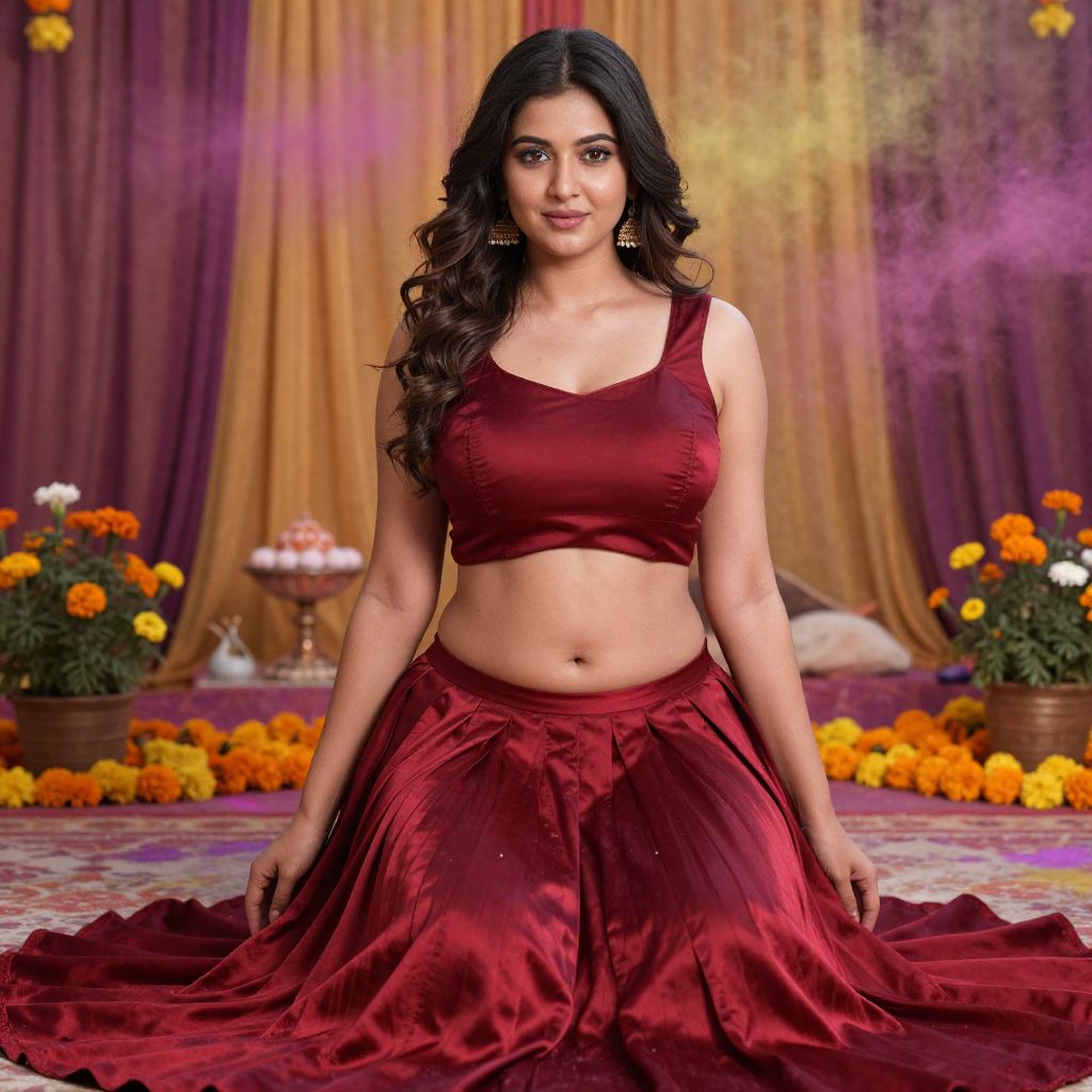 A woman with warm brown eyes and soft, natural skin tone wearing a rich crimson silk readymade churidar costume, the fabric flowing elegantly over her hips and legs, set against a traditional Holi festival backdrop with colorful powder in the air and vibrant marigold flowers in the background.. The woman has big tits and cute face