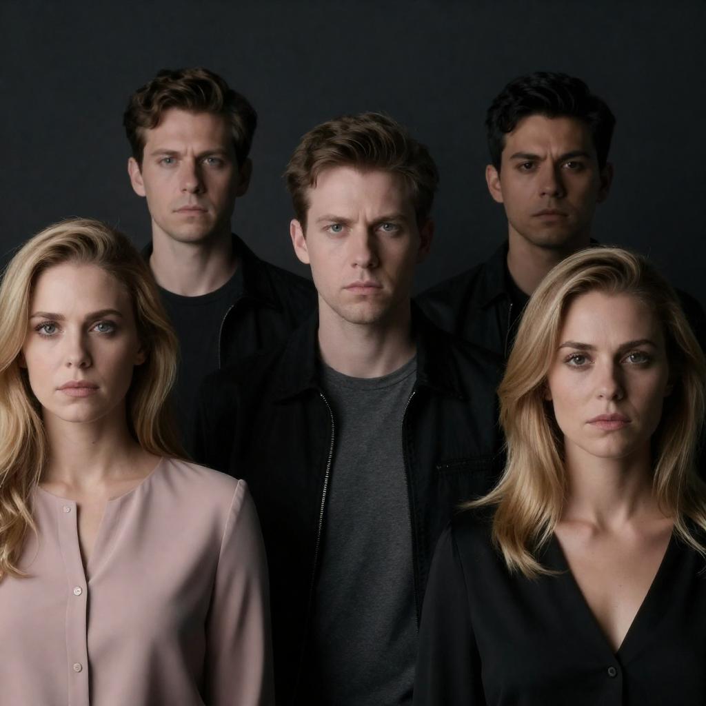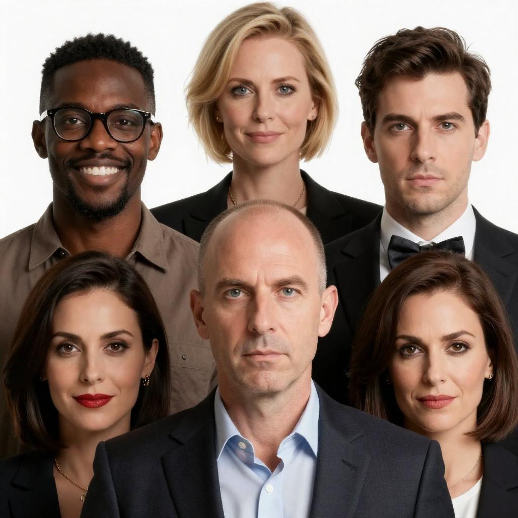 Photograph of five people standing close together. Center: balding man in dark suit, serious expression. Left: smiling Black man with glasses, brown shirt. Top: blonde woman with short hair, blue eyes, subtle smile. Right: dark-haired man with white shirt, bow tie, intense gaze. Bottom: dark-haired woman with bob cut, red lipstick, slight smile. White background.