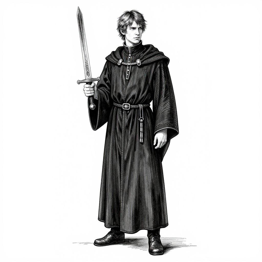 Black-and-white digital drawing of a serious, young man with short hair, wearing a long, hooded cloak and holding a sword, standing against a