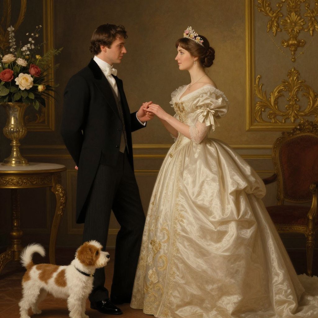 A finely detailed digital artwork reminiscent of classical portraiture, featuring a man in a formal black suit and a woman in an elegant cream gown adorned with a floral tiara, sharing a tender moment as they hold hands amidst a richly decorated interior with golden lighting and a charming dog in the foreground.