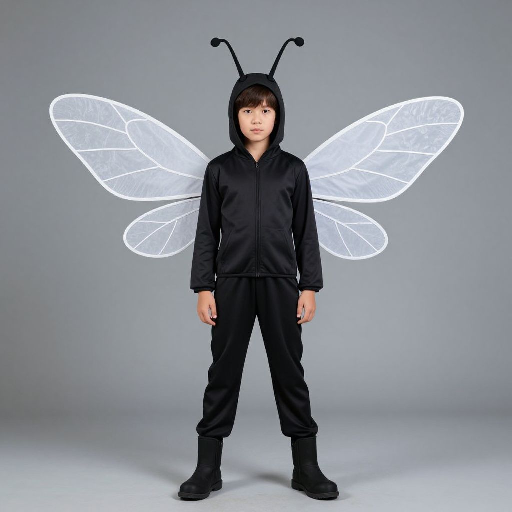 Giant ant costume, 1boy, male focus, solo, antennae, full body, hood, pants, standing, grey background, insect wings, looking at viewer, boots, wings, hoodie