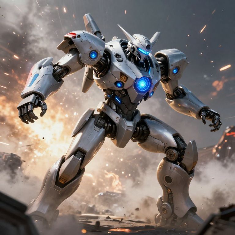 A highly detailed CGI image of a futuristic, white and silver robotic warrior standing amidst a chaotic battlefield. The robot has glowing blue eyes and a blue light on its chest. Its design features angular, armor-like plates with red and blue accents. The background is filled with explosive fire and debris, creating a dynamic, action-packed atmosphere. The robot's stance is powerful, with its left arm slightly raised and right arm down. The lighting emphasizes the robot's metallic texture and the intense combat environment.