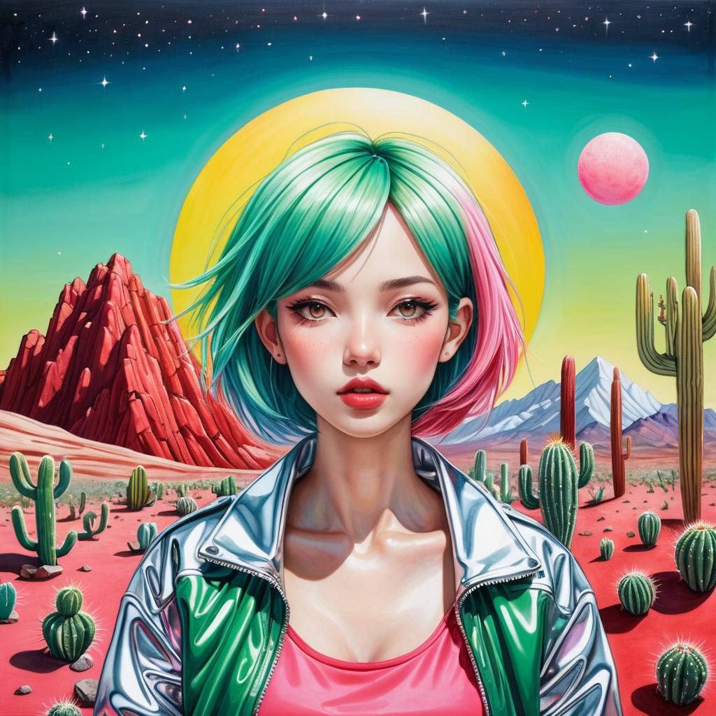 Digital artwork of a futuristic young woman with silver hair in a shiny metallic silver cropped jacket and red shorts standing in a desert landscape filled with various cacti. The background features stylized red mountains and a large, glowing sun with gradient colors from pink to yellow, set against a green sky.