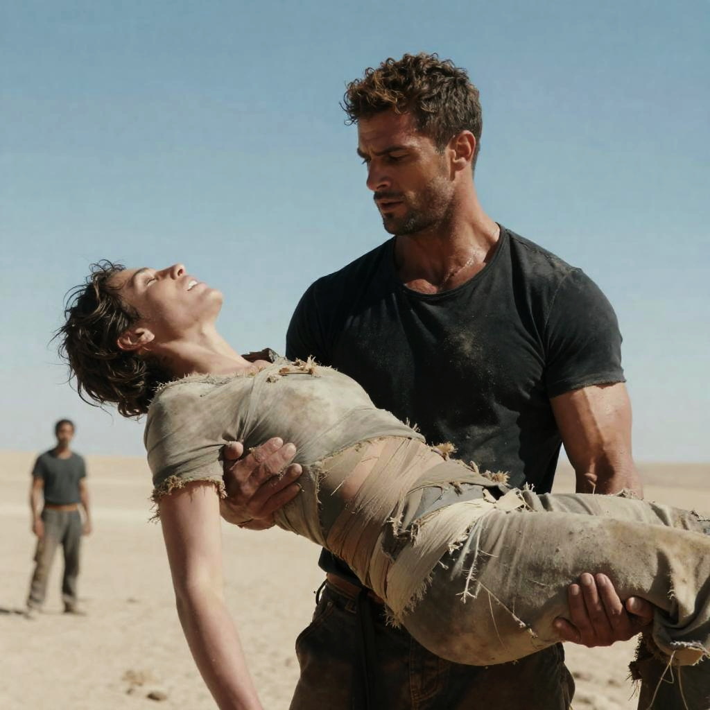 Photograph of a muscular man with short, curly brown hair, intense expression, wearing a black shirt, holding a lifeless person wrapped in tattered, dusty gray fabric. Desert background, clear blue sky, man's right arm supporting person's head, left arm under body. Two people, one standing, one lying down.