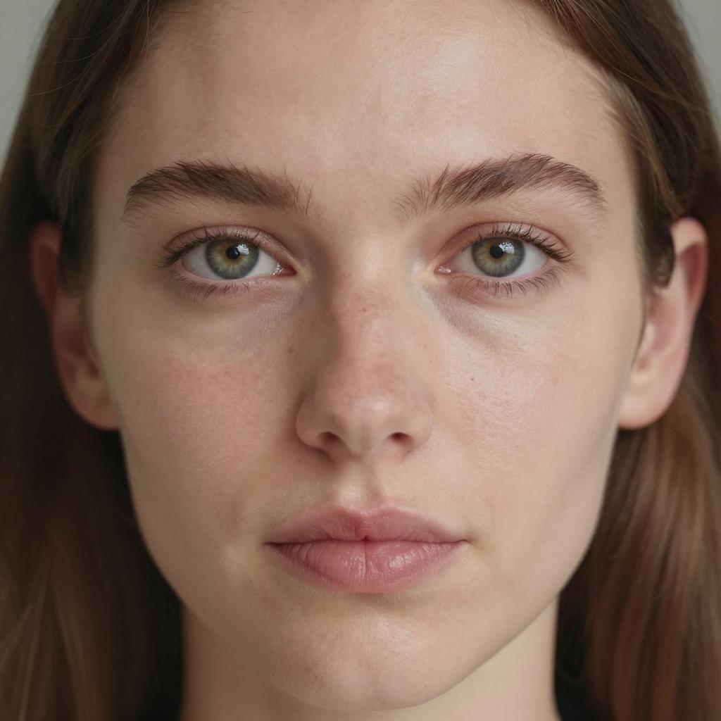 Close-up photograph of a woman's face, focusing on her blue eyes, light brown eyebrows, and fair skin. Her slightly parted lips and light blonde hair are partially visible on the right. Her gaze is intense, with slight eye reflection.