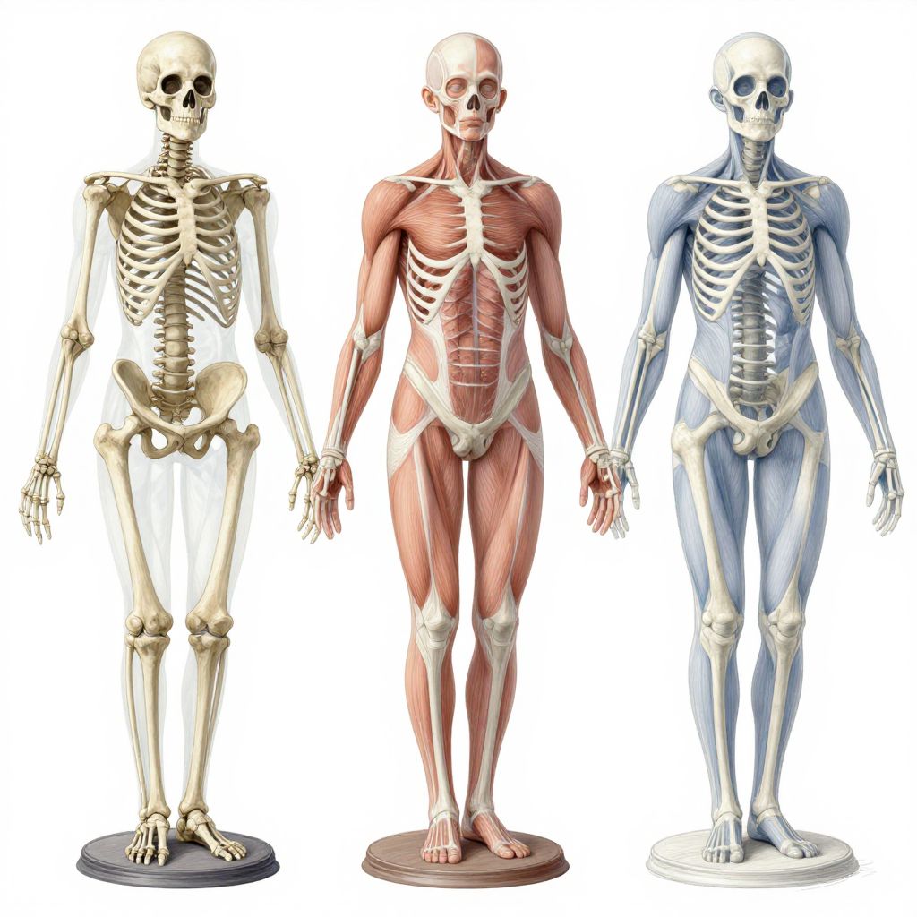 Body base drawing ideas presenting a layered anatomical study from skeleton to musculature, displayed in a semi-transparent style with color-coded sections, in an educational format suitable for artists to understand human form and structure.