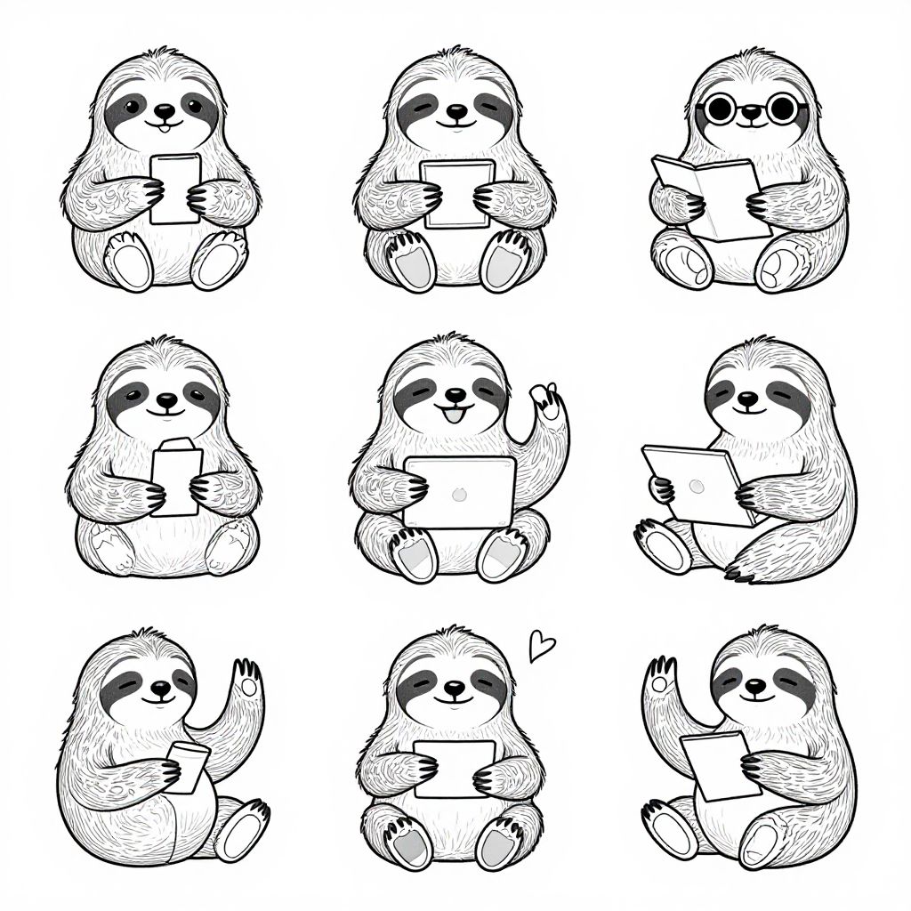 A black-and-white digital illustration featuring a 3x3 grid of cute, cartoon sloths holding various items. Each sloth, with a fluffy texture and distinct black eye markings, is seated and holding a different object: a book, a tablet, a sheet of paper, a pencil, or an apple. The sloths have a simple, round body shape and small, triangular ears. The background is plain white, emphasizing the sloths and their activities. The style is whimsical and charming, with clean, bold lines and minimal shading.