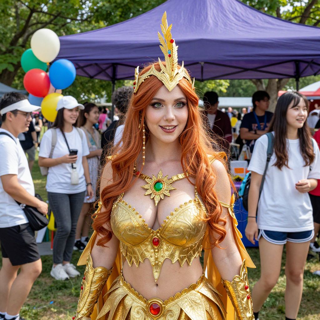 A vibrant outdoor costume festival at a sunny weekend park, featuring a diverse group of people in elaborate and creative costumes, including a woman in a golden phoenix costume with long flowing red hair and expressive eyes, standing under a large purple canopy with smiling neighbors and colorful balloons in the background.. The woman has big tits and cute face
