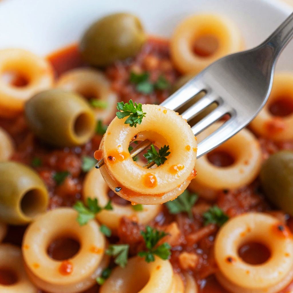 Close-up photograph of pasta rings with green olives, tomato sauce, parsley, and a fork holding a glistening ring.