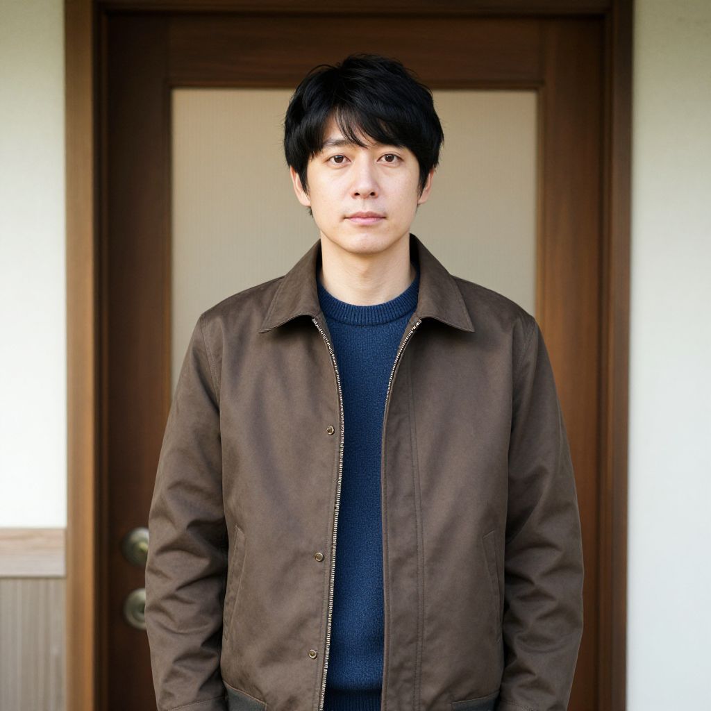Photograph of an East Asian man standing in a doorway. He has short, black, slightly messy hair and a neutral expression. He is wearing a brown, unzipped jacket over a navy blue, ribbed-knit sweater. The wooden door behind him has a frosted glass panel, with a silver door handle visible on the left side. The wall to the left is white, and there is a small window partially visible. The lighting is natural, highlighting his face and upper body, creating a slightly overexposed effect on his face.