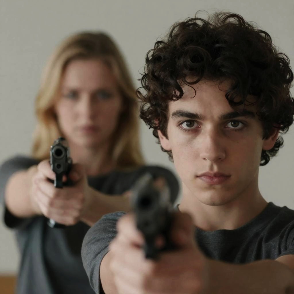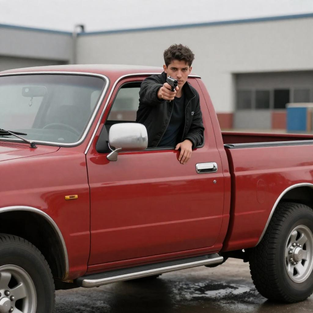 Photograph of a young man with short dark hair, wearing a black jacket and jeans, leaning out of the driver's side of a red and white pickup truck. He points a handgun towards the camera with a determined expression. The truck is parked on a wet, gray pavement with industrial buildings in the background.