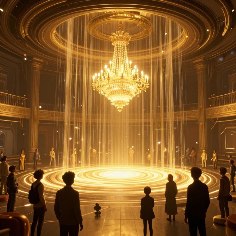 In a surreal, cyberpunk-inspired 3D-rendered ballroom bathed in dramatic golden lighting, a sentient chandelier cascades luminous strands toward a swirling event horizon, as confused time travelers gather in awe beneath its ethereal glow.