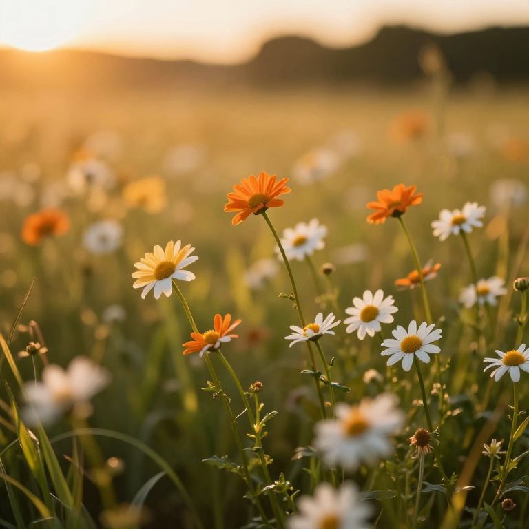 Photograph of a sunlit meadow with white daisies and orange Cosmos flowers, blurred background, warm golden hour light, soft focus.