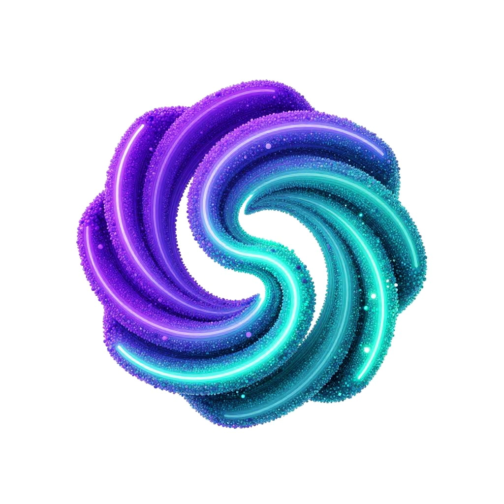 Stable diffusion logo concept, vibrant swirling particles forming a cohesive shape, blending shades of purple and teal, representing AI-powered generative art, clean lines with glowing highlights, modern digital art style