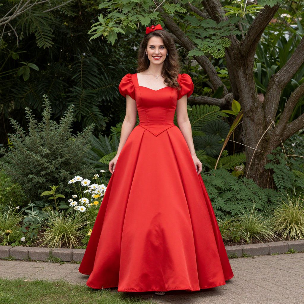 Photograph of a smiling woman standing outdoors in a garden, wearing a vibrant red, full-length, satin ball gown with puffed, short sleeves and a square neckline. The dress has a fitted bodice with a subtle V-shaped detail and a voluminous, flared skirt. She has long, wavy brown hair adorned with a red bow. The background features lush green foliage, a tree with thick branches, and white flowers with yellow centers. She stands on a concrete path bordered by low shrubs. The bright red of her dress contrasts sharply with the greenery.