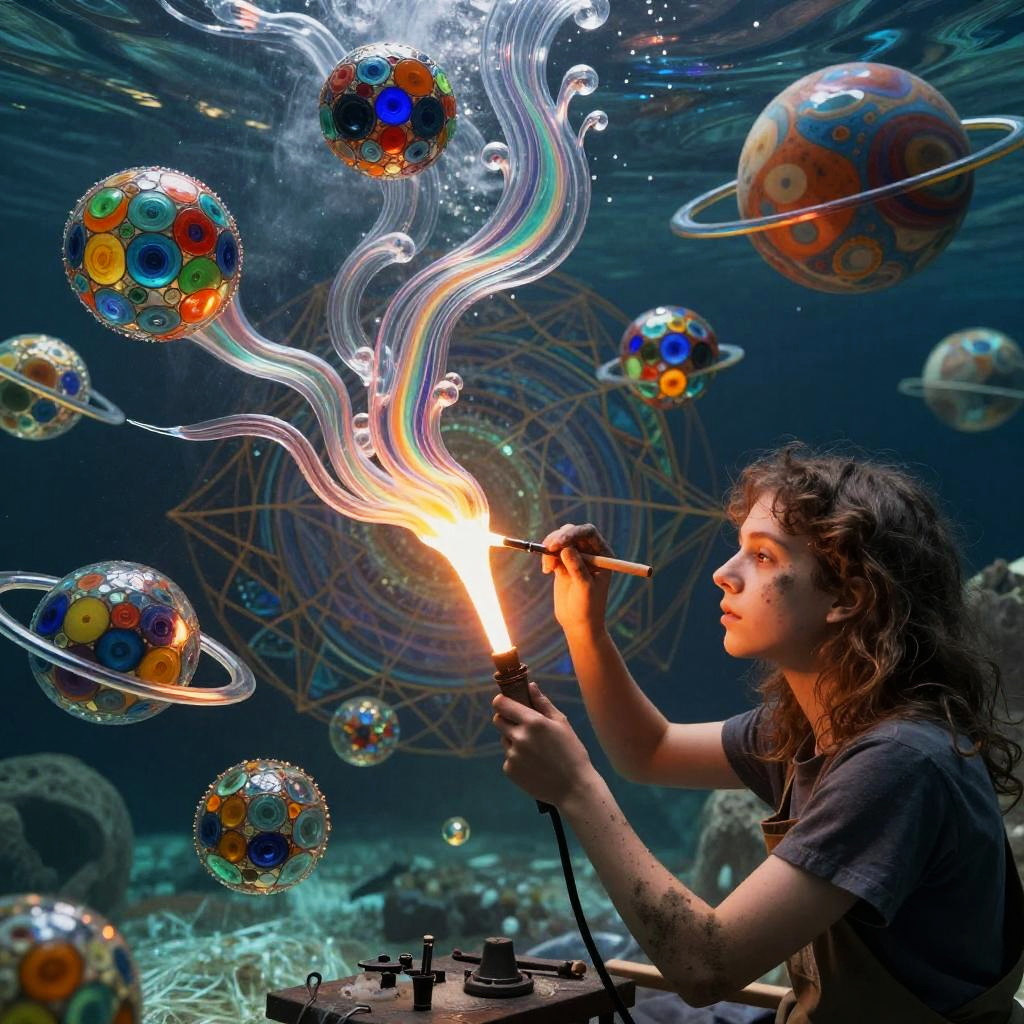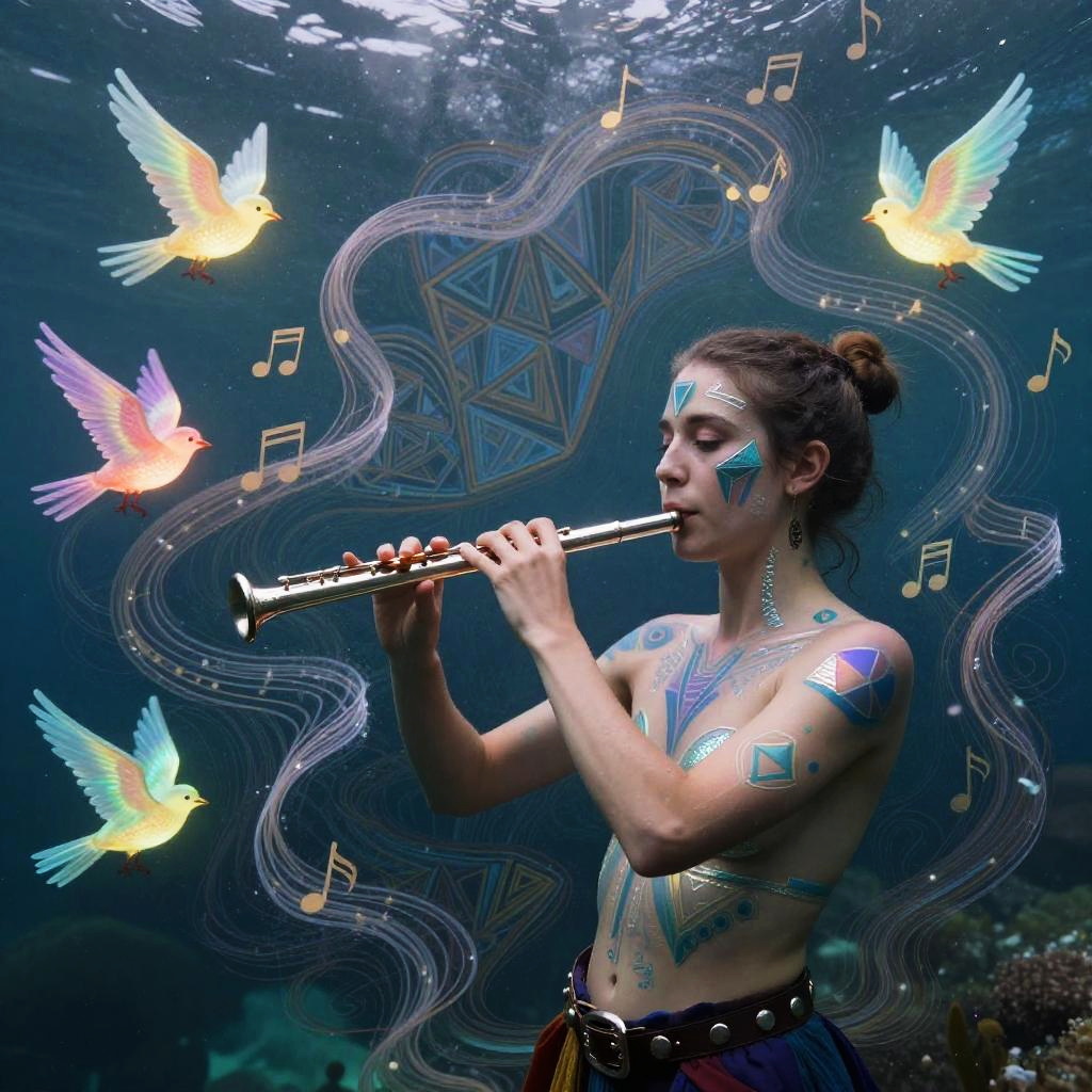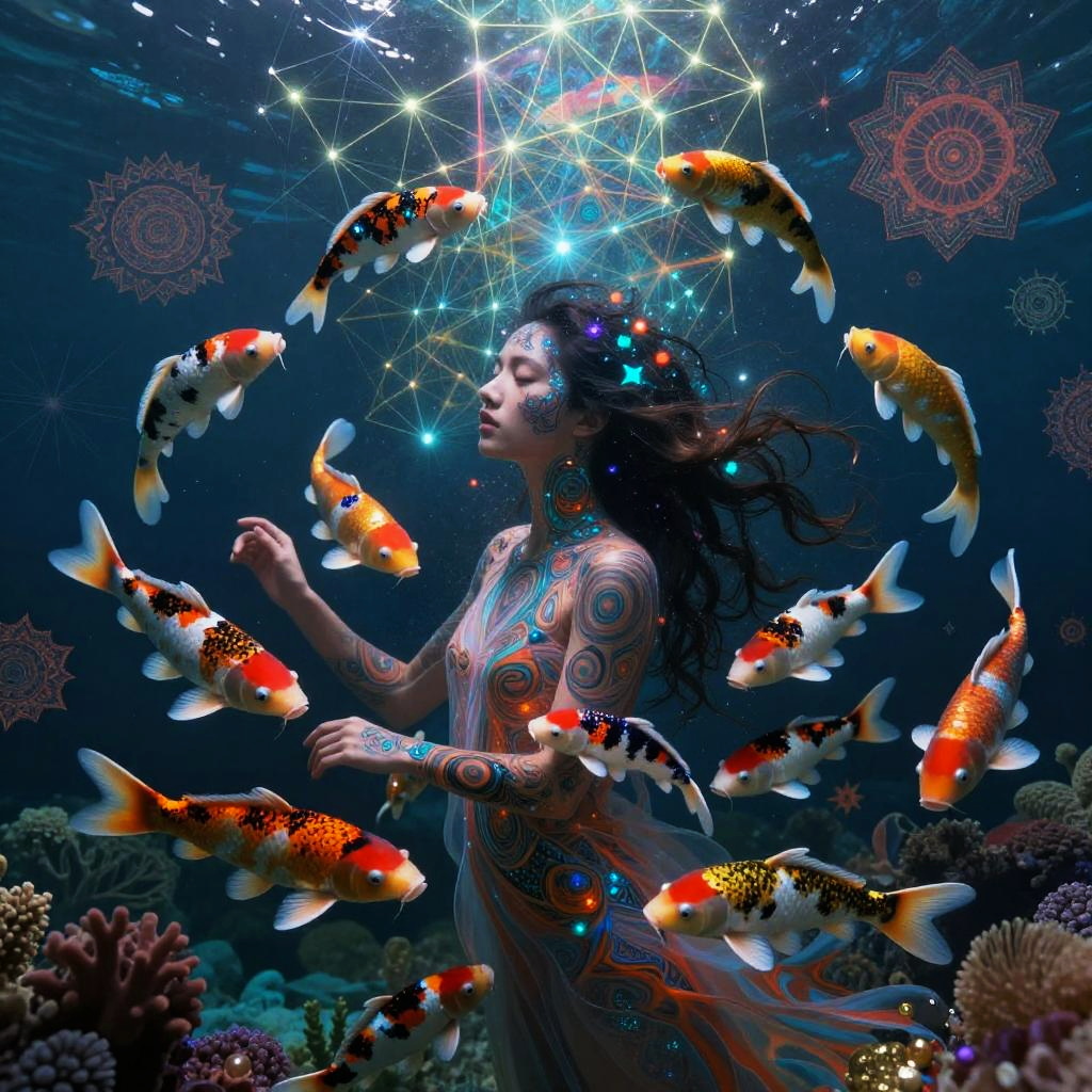 A young man with kaleidoscopic tattoos on a psychedelic journey, witnessing himself shattering into beams of light, submerged in a vast chaotic ocean of vibrant colors and swirling patterns. He merges with the water, experiencing unity with the universe, perceiving existence from countless viewpoints.