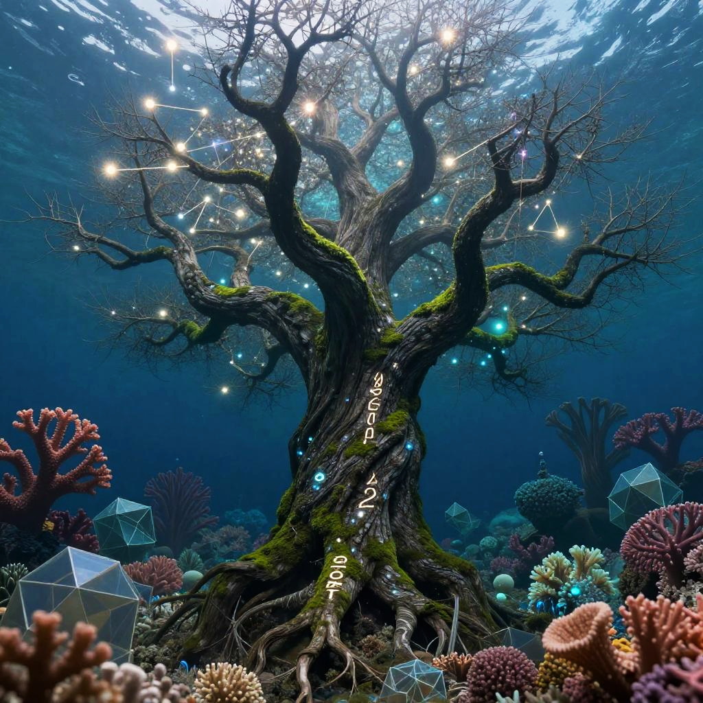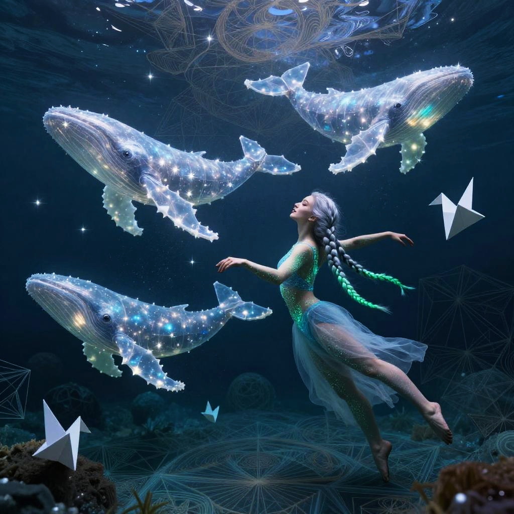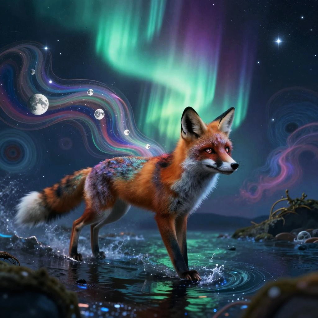 A young man with kaleidoscopic tattoos on a psychedelic journey, witnessing himself shattering into beams of light, submerged in a vast chaotic ocean of vibrant colors and swirling patterns. He merges with the water, experiencing unity with the universe, perceiving existence from countless viewpoints.