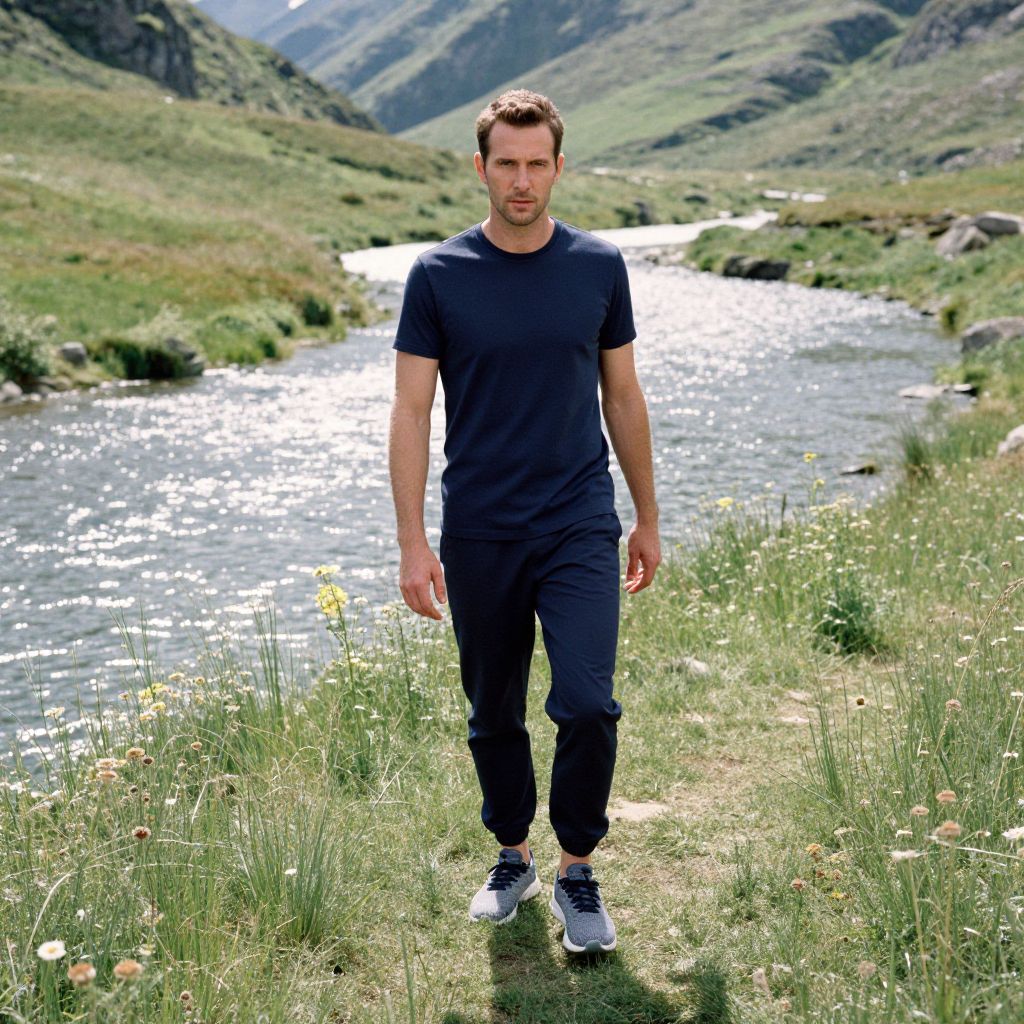 "a man, slim-fit moisture-wicking t-shirt, lightweight stretch joggers, breathable mesh sneakers, color-blocked navy and gray, meandering through lush green valleys, sunlight glinting off rippling water, kodacolor analog film, relaxed expression, surrounded by wildflowers. Man has masculine face and piercing eyes"