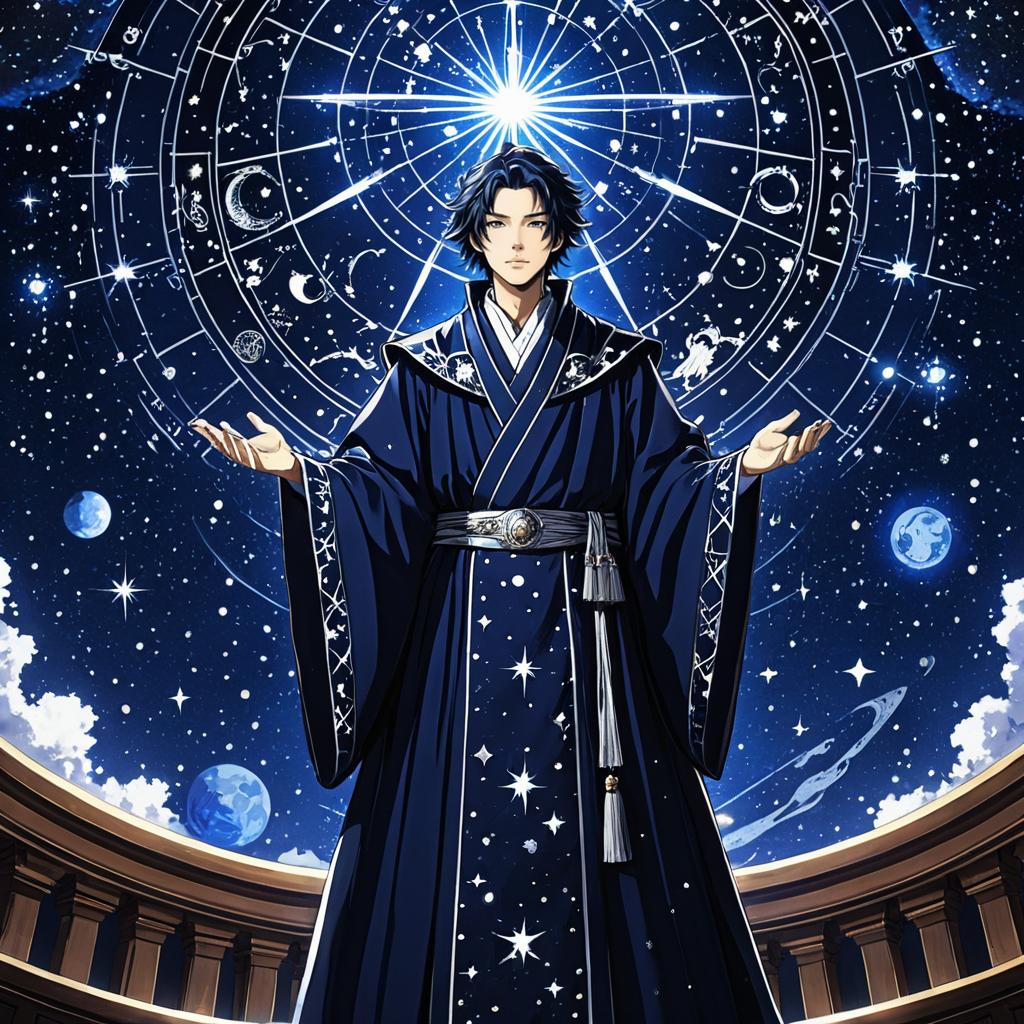 An elegant sorcerer, wearing a regal midnight blue robe adorned with silver constellations, standing in an astral observatory overlooking a star-filled night sky, surrounded by glowing celestial symbols, illustrated in the elegant and magical anime style of Kosuke Fujishima.
